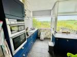 With a range of wall and base units with wooden worktops with an inset corner stainless steel sink with drainer, electric hob with an extractor fan over, electric double oven, integral fridge, washing machine, dishwasher, tumble dryer, tiled flooring and tiled splashback.
