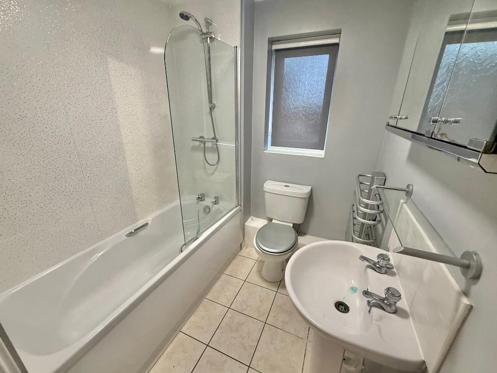 Benefitting from a three piece suite including a bath with modern panelling and a chrome shower over, pedestal sink and a low flush W.C. The room further boasts tiling to the floor and a stylish chrome electric towel radiator.