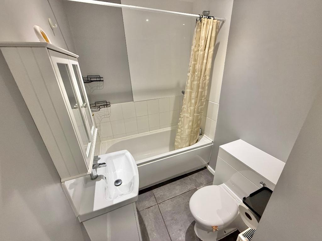 5' 4'' x 6' 0'' (1.63m x 1.84m) Benefiting from a 3 piece white suite including a bath with chrome mixer shower over, vanity sink and low flush back to unit toilet.