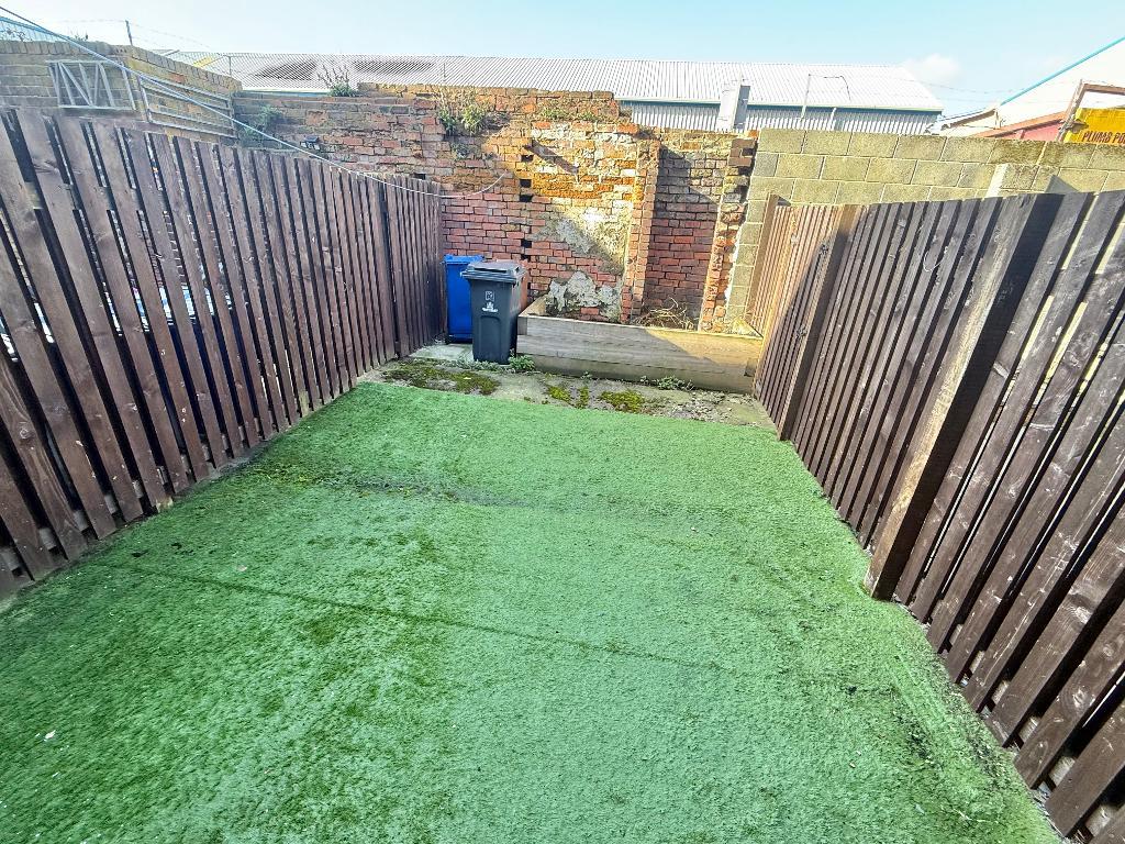 An enclosed rear garden space which benefits from artificial grass.