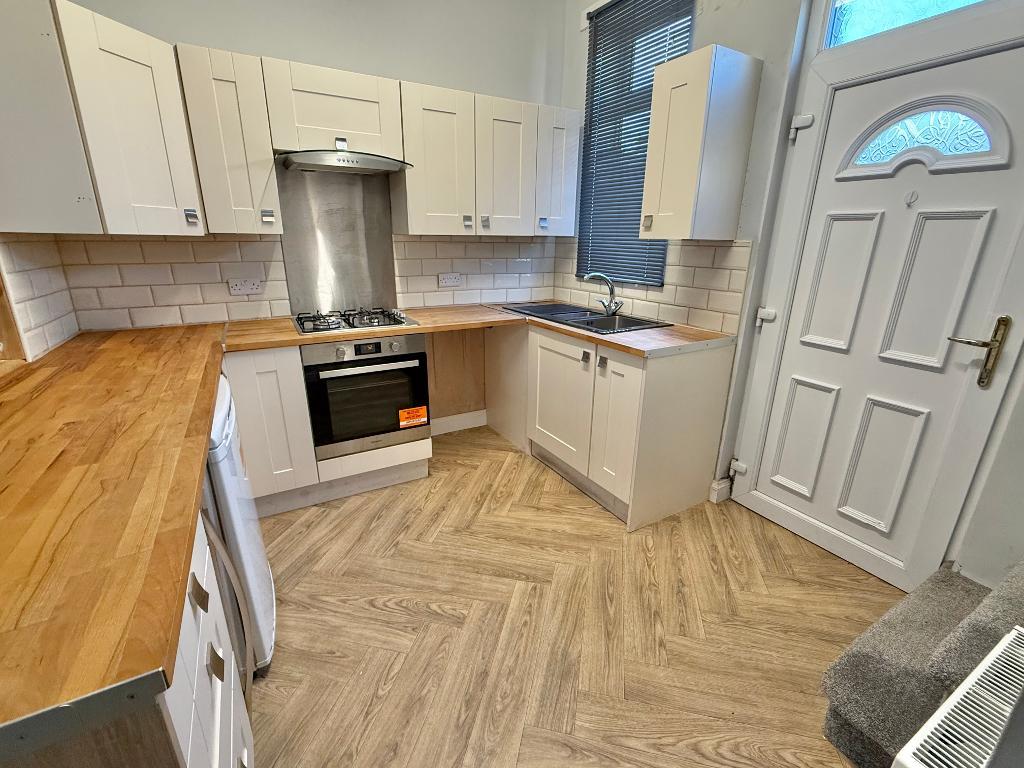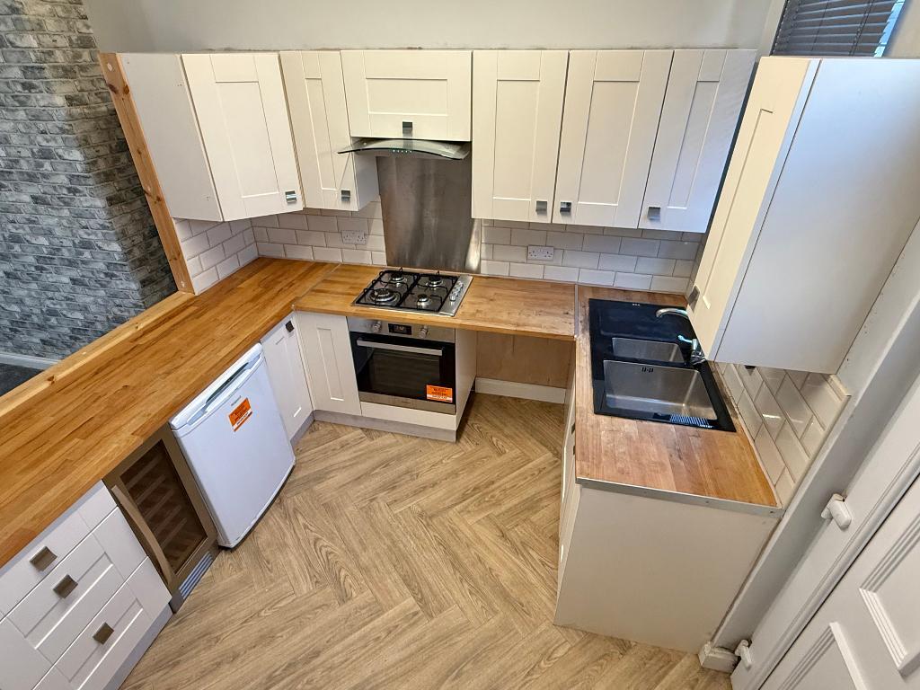 9' 4'' x 12' 2'' (2.85m x 3.71m) Boasting a modern Kitchen with integrated appliances including Hot Point electric oven, gas hob and extractor over plus a slim line wine cooler. Space is provided for a washing machine and fridge and further features include vinyl flooring, tiled splash back and blind to the window. A rear door gives access to the garden and stairs to the first floor.