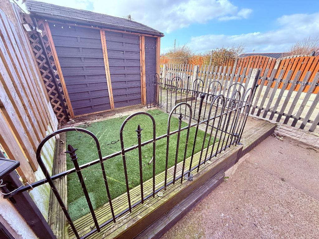 To the rear of the property is a small astro turf garden area with balustrade along with a decking area, which requires some immediate attention. A large shed and detached garage are to the back of the garden along with a parking space for a car.