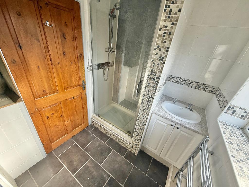 5' 10'' x 6' 7'' (1.8m x 2.01m) Benefiting from fully tiled walls and floor with a white 3 piece suite, comprising of an over sized 'walk in' shower with chrome mixer over, vanity sink and low flush WC. The room further benefits from a radiator and window with frosted glass.